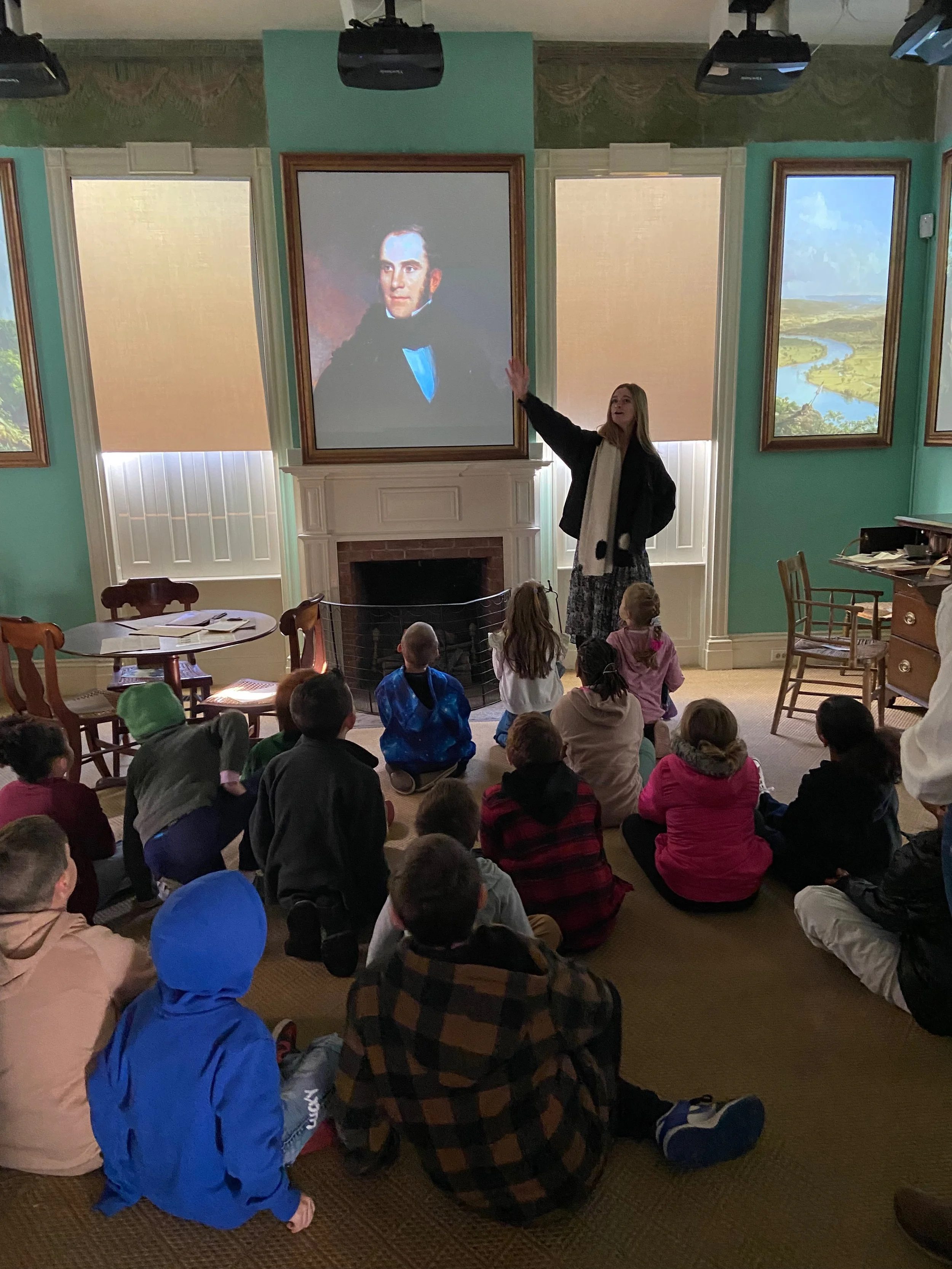 Talking to the Catskill 3rd graders about the wall borders in the East Parlor.
